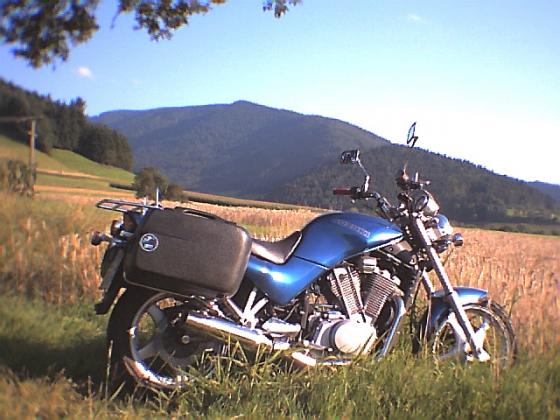 Windshield, H & B Trägersystem, H & B Koffer, H & B Topcase, Stahlflex vorne, Sturzbügel, LSL Tourenlenker, VX 800 Edelstahl Kühlerschutz, Wirth Gabelfedern, Farbe: Blau