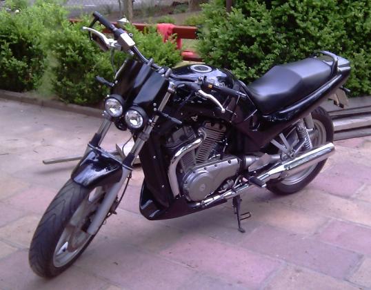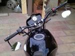 Doppelscheinwerfer mit Buell-Windshield, LSL-Lenker + Griffe, Lenkerendenspiegel, 60mm Tacho mit integrierten Kontrollleuchten, LED-Blinker rundum, Minihupe, anderer Nummernschildhalter. Bereits schon dran gewesen: Stahlflex v+h, Bugspoiler.