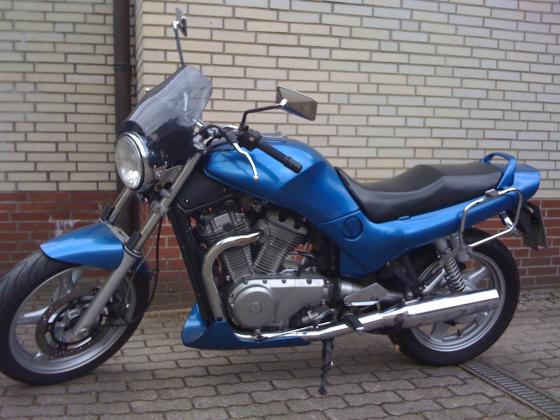 LED Blinker, LED Rücklicht, LED Beleuchtung im Tacho und Drehzahlmesser,Stahlflex-Bremsleitung vorne und hinten, Reifen: Pilot Road2, Mini Scheibe, Bugspoiler, Givi Kofferträger
