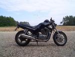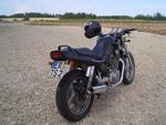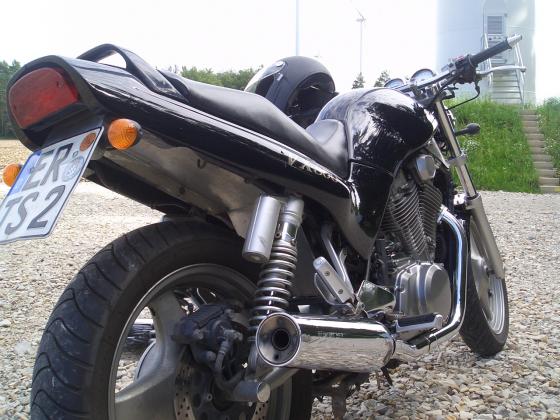 -gerader Lenker mit spitzen Vibrationsdämpfern -Schutzblech aus Alu -kleine Blinker -Gabel durchgesteckt(30mm) -Edelstahlbleche seidlich unterm Tank,am vorderem Schutzblech und Lichtaufhägung Bei Bedarf: -suzuki Ledertaschen -getöntes Windschild